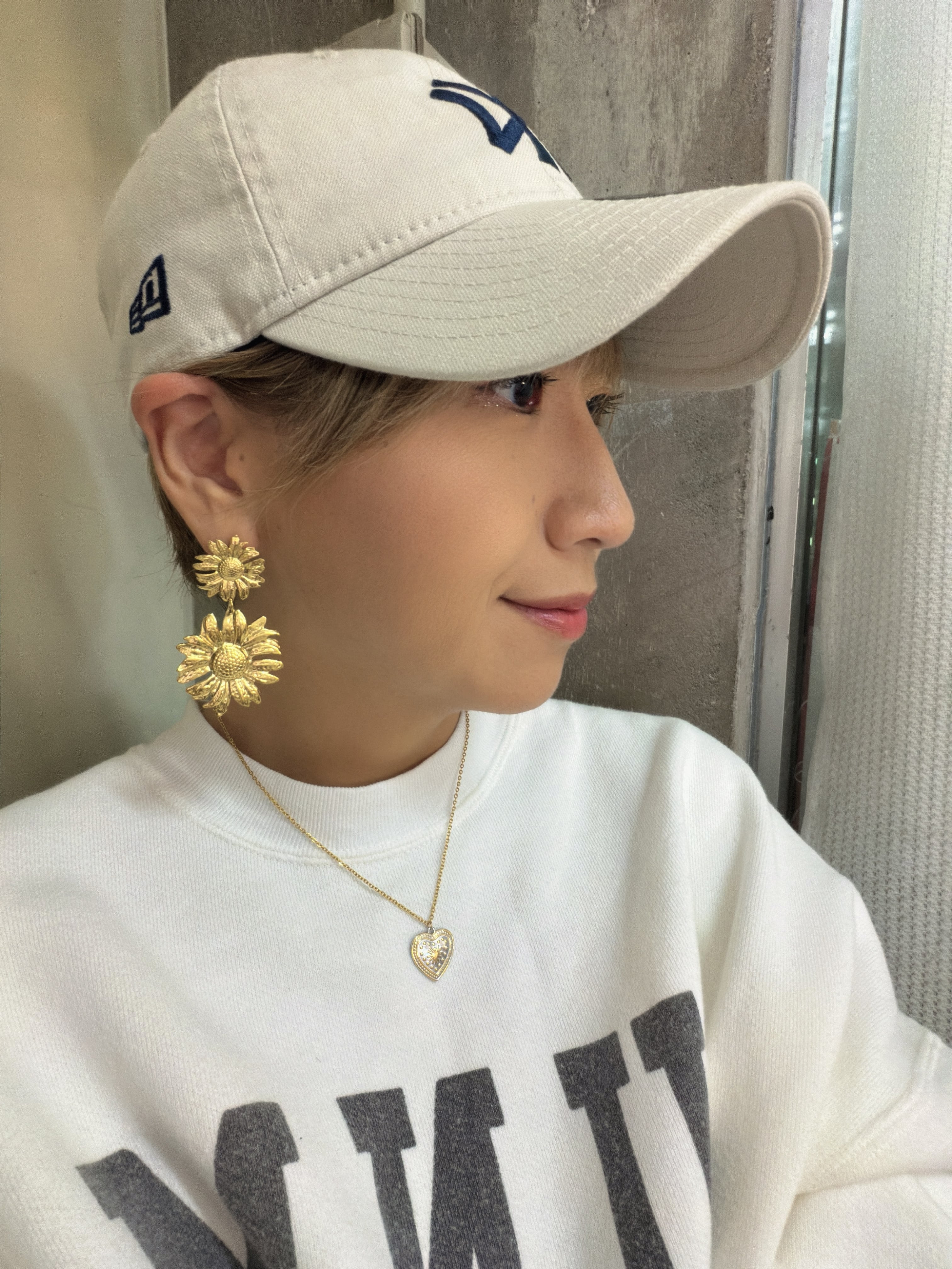 キャップに大ぶりピアスも可愛いです!